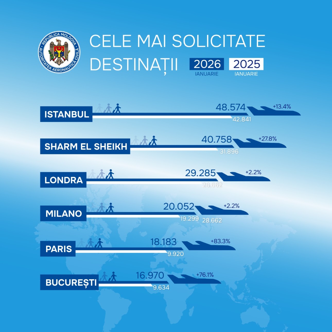 În ianuarie 2026, 447.127 de pasageri au călătorit de pe și către Aeroportul Internațional Chișinău – o creștere de +35,4% față de ianuarie 2025 (330.233 pasageri).