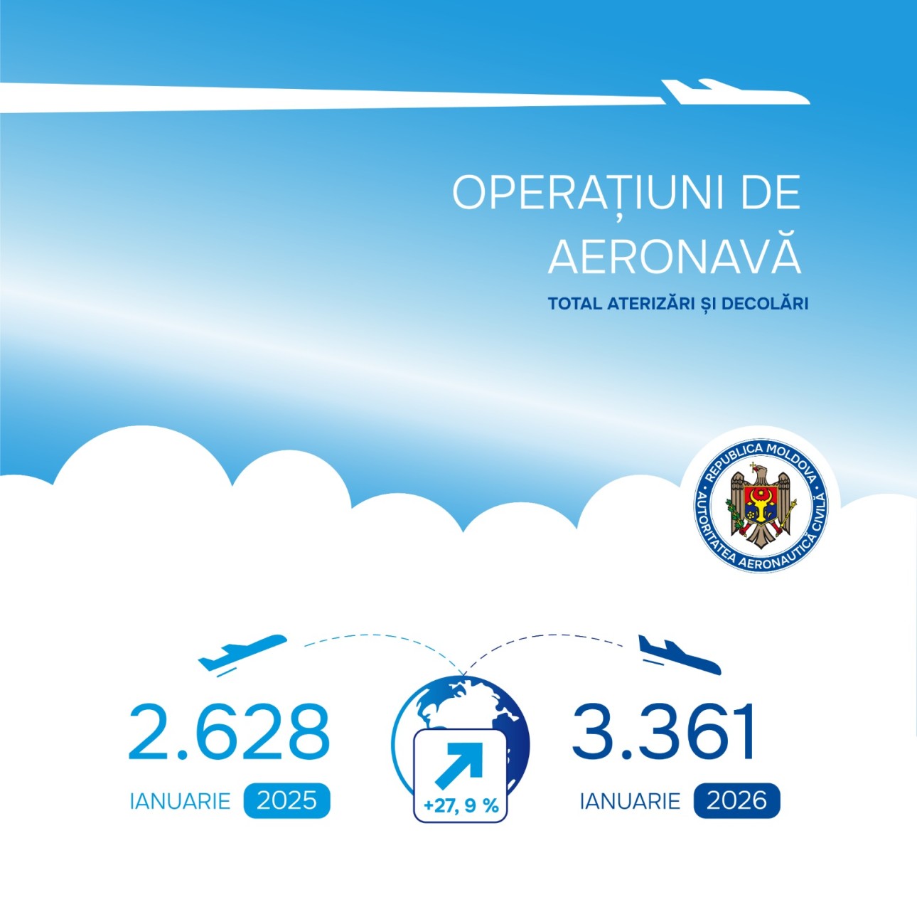 Au fost înregistrate 3.361 operațiuni de aeronavă, cu +27,9% mai multe comparativ cu ianuarie 2025 (2.628).